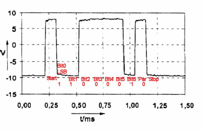 hallo. hänge voll an dieser aufgabe. kann mir jemand helfen? a) Charakterisieren Sie mit einigen Stichpunkten die Datenübertragung mittels einer RS 232-Schnittstelle. Benennen Sie zusätzlich Vor- und Nachteile. b) Skizzieren Sie den Aufbau der Übertragungsleitungen einer RS 232-Verbindung zweier Teilnehmer mit einer minimalen Anzahl von Verbindungsadern bei Vollduplexbetrieb. c) Auf der Übertragungsleitung einer RS 232-Schnittstelle wurde bei einer Übertragungsrate von 9600 Baud (Bit pro Sekunde) der nachfolgend dargestellte Spannungsverlauf gemessen. Ermitteln Sie den Hex-Wert des übertragenen ASCII-Kodes! Welches ASCII-Zeichen wurde gesendet (1 Startbit, 7 Datenbits, 1 Paritätsbit - gerade, 1 Stopbit, das niederwertigste Datenbit wurde dabei zuerst übertragen)? DIAGRAMM ZU C HABE ICH ANGEHÄNGT d) Welche Zeit wird für die Übertragung des Textstringes Datenübertragung mittels RS232 Schnittstelle bei einer Baudrate von 9600 (7 Datenbits, 1 Startbit, 1 Paritätsbit, 1 Stopbit) benötigt? e) Warum erfolgt bei der RS 232 eine Umsetzung der TTL- bzw. CMOS-Pegel auf einen Wert von +15V bzw. -15V? DANKE