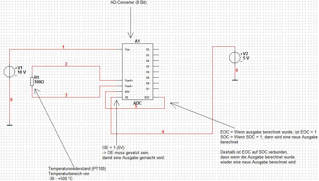 Hallo Leute :) Ich will mit dieser Schaltung und einem Microcontroller eine Temperatur messen (bzw. den Spannungsabfall des Temperatursensors. Die Ausgegebenen Werte will ich dann mit dem Microcontroller umwandeln und auf mehreren (ich denke mal 3 Stück) 7Segment-Anzeigen darstellen. Wie das ganze mit dem ADC funktioniert, habe ich (denke ich doch) verstanden :) Ich hab in der Schaltung einen 8 Bit ADC verwendet. Ich weiß zwar, dass es auch digitale Temperatursensoren gibt, aber der Temperatursensor sitzt hinten im Auto, die Auswertung vorne. Und ich will so wenig Kabel dort nach hinten ziehen wie möglich :) (oder habe ich da einen Denkfehler drinnen?) Der Temperaturbereich soll so zwischen -30 bis ca 450°C sein. Es muss nicht so extrem genau sein :) Jetzt meine Frage: Funktioniert die Schaltung überhaupt so? Wie mache ich das, dass ich den gesammten Temperaturbereich habe? Muss ich da noch irgendwo was mit nem Poti machen, dass ich den Sensor einstellen kann? Woher weiß ich, bei welcher Spannung ich welche Temperatur habe? Und nur so Informationshalber: Wenn ich einen ADC mit 16 Bit verwenden würde, wie kann ich die 16 Bit auswerten, wenn ich einen Microcontroller habe (ATMEL 89C5131), der zwar mehrere 8 Bit eingänge hat, aber es sind ja nur 8 Bit eingänge... :) Vielen vielen dank schon mal im vorraus :) Grüßle, Sunnyboy