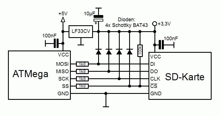 Ich hänge halt mal meine Schaltung an. Den PullUp am CS-Anschluss der Karte kann man auch weglassen, den habe ich nur sicherheitshalber eingebaut, weil ich die SD-Karte fix einbaue und beim AVR-Flashen in der Schaltung drin lasse. Ein Pegelwandler wäre natürlich "professioneller", geht aber auch so.