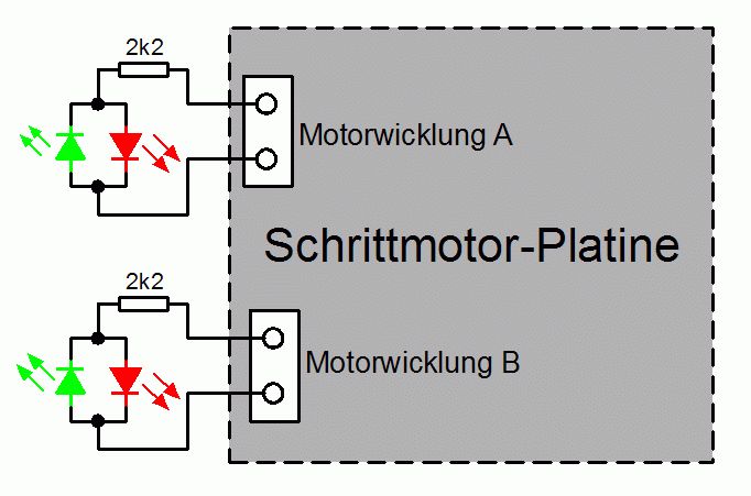 Da jetzt also feststeht, dass der Fehler irgendwo (auch in der Platine) liegen kann, systematisch vorgehen: Beide Versorgungsspannungen anschliessen, an den Ausgängen für die Motorspulen KEINEN MOTOR, sondern jeweils zwei antiparallele Leuchtdioden (vorzugsweise rot + grün) mit Vorwiderstand anschliessen. Alle Logikeingänge auf festes Potential, an den Takteingang einen sehr langsamen Takt (z.B. alle 2-3 Sekunden ein Impuls) anlegen. Dann solltest du sehen, wie die Zustände der Motorspulen der Reihe nach durchlaufen. Drehrichtung am entsprechenden Logikeingang umschalten, die Spulenzustände müssen sich in entgegengesetzter Reihenfolge ändern. Takteingang auf festes Potential, die Motorausgänge dürfen sich nicht mehr ändern. Funktioniert das soweit, dann ist geklärt, dass der Fehler vermutlich beim Motor oder an der Verdrahtung zum Motor liegt. Dann als erstes den Strom der Spulen messen.
