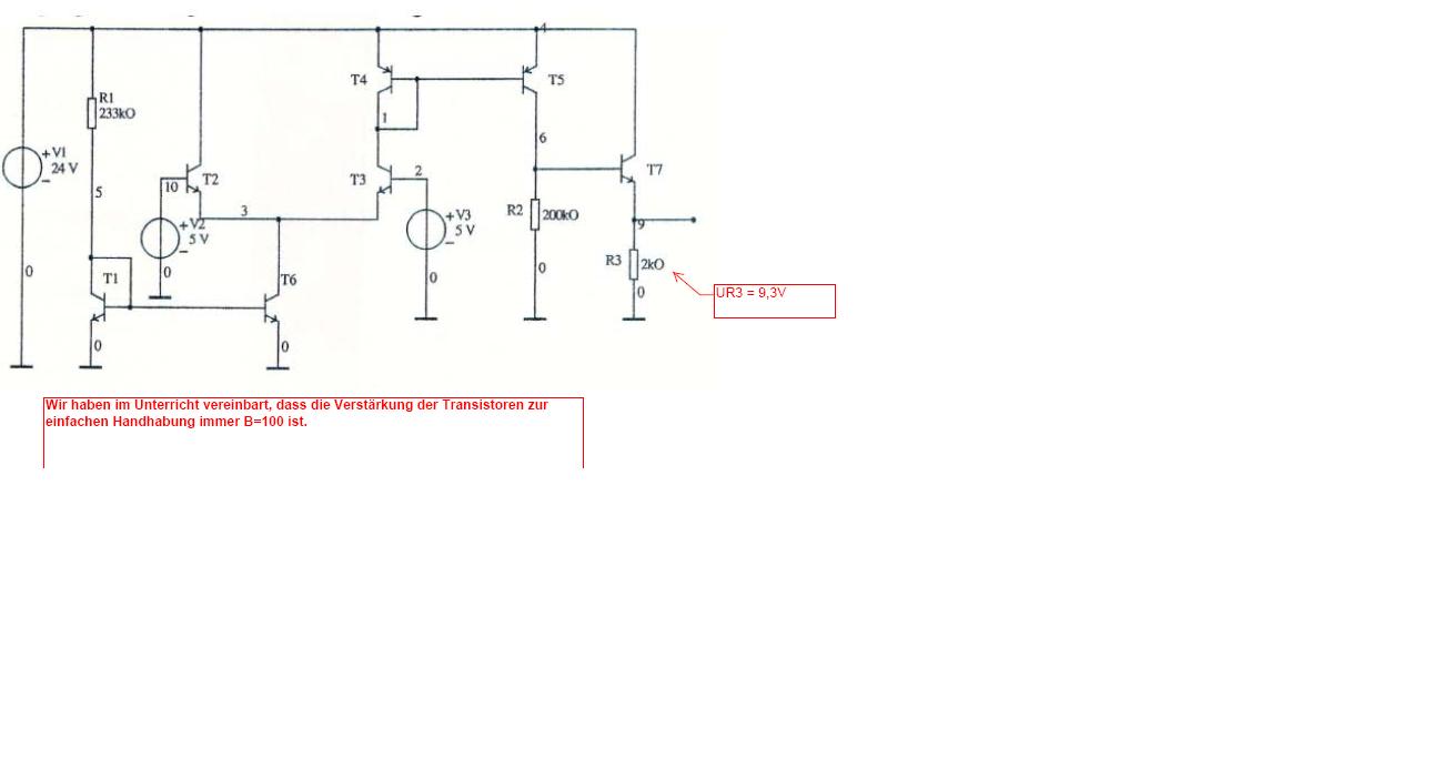 Die 9,3V sind wohl unter der Annnahme, dass B für alle Transistoren unendlich ist und damit alle Basisströme 0 sind, berechnet worden. Wird für T7 B auf 100 reduziert, teilt sich der Kollektorstrom von T5 in den Strom durch R2 und den Basisstrom durch T7 auf. Der Kollektorstrom von T7 ist das (B+1)-fache des Basisstroms. Mit diesen beiden Erkenntnissen und dem Ohmschen Gesetz kann man eine einfache Gleichung aufstellen und daraus U9 ausrechnen. Immer noch zu schwierig? Ich komme auf U9=4,67V (hoffentlich habe ich mich nicht verrechnet). Etwas interessanter, aber immer noch leicht lösbar wird das Ganze, wenn man für alle Transistoren B=100 annimmt.