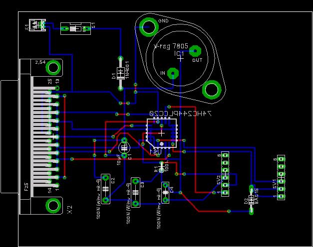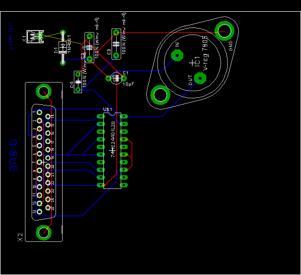 Eine Optimierung wäre sicherlich sinnvoll!! Ich bin mir sicher, dass die Schaltung auf eine 1-Seitige Platine passt und ohne (viel) Drahtbrücken :-). Rücke die Bauteile mal enger zusammen und Layoute nochmal neu! Denk an dickere Versorgungsleitungen und kurze Wege. Die Platine lässt sich bestimmt um ca 50% verkleinern! Die Kondensatoren kommen mir recht groß vor und den HC244 würde ich im DIL Gehäuse nehmen, dann kommst Du noch zwischen den Pins durch. @Peter: Den 7805 gibt's glaube ich als 5A Version in TO3.. Das dürfte reichen, falls mal zwischen zwei Pins etwas Kupfer zuviel geblieben ist :-) Sicherlich könnte man noch optimieren... Aber... Das Layout hat schon in die UV-Lampe geblickt und da ändert sich so schwer was grins Gruß, A.B. PS: Der HC 244 sollte ein HC 174 sein :-)