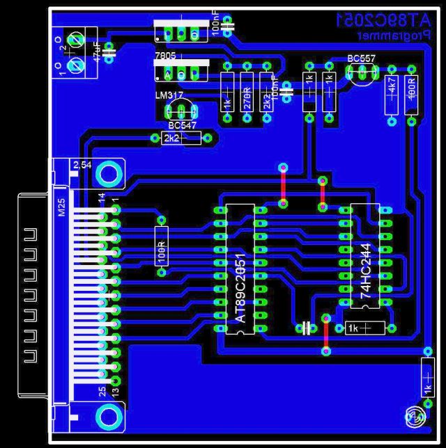 Hi, hier noch ein paar Tipps zum Layouten: 1) Versuche den Autorouter zu umgehen, das sieht meisst nicht besonders schön aus, bzw. routet er manchmal sehr kompliziert! 2) Wenn Du 2-Seitige Platinen machst, versuche auf einer Ebene die horizontalen, auf der anderen die vertikalen Bahnen zu ziehen. 3) Masse- und Versorgungsverbindungen immer recht dick ziehen und wo es geht ganze Flächen stehen lassen, das spart ganz nebenbei ne Menge Ätzflüssigkeit. 4) Die Leiterbahnen ruhig etwas dicker ziehen, wenn Du unter ICs durch musst, kannst du die Breite zwischen den IC-Pins verkleinern 5) Und nun ran an's Werk :-) Gruß, Andreas PS: Ich habe von einigen Tagen zufällig auch einen Atmel Progger gelayoutet, Schaltplan gibt's auf der Homepage von IC-Prog (evt. googeln). Das Ding nennt sich TAFE. Habe mal mein Layout angehängt...
