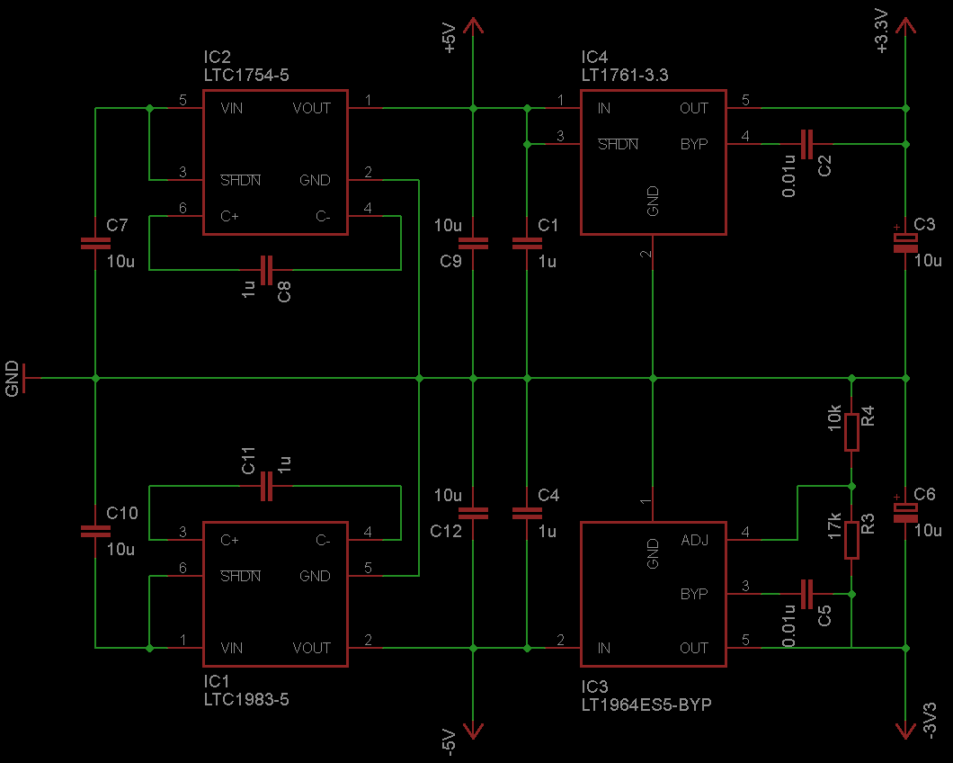 so, nochmal Danke für die Anregungen. Ich hab mir mittlerweile auch mal ein paar Schaltregler und Ladungspumpen angeschaut. Wäre es möglich, z.B. mit einem Step-Up-Wandler (am liebsten Ladungspumpe, weil keine Induktivitäten) von 2.4 oder 4.8V (ich weiß, jetzt sind es plötzlich nich mehr 12V, aber der zu verwendende Akku is eben noch nich spezifiziert, bin da noch recht frei) auf 5V zu wandeln und danach mit ner invertierenden Ladungspumpe auf -5V bzw. mit einer geregelten invertierenden Ladungspumpe die -5V erzeugen und dahinter jeweils +/-3.3V Linearregler oder gibts da Einwände? Das zumessende Frequenzband endet übrigens bei ca. 150Hz. Ich denke mit halbwegs vernünftiger Filterung sollten sich da die Schaltfrequenzen eliminieren lassen oder? Als Regler hab ich im Moment die beiden hier im Auge: Für die +5V: LTC1751-5 http://www.linear.com/pc/downloadDocument.do?navId=H0,C1,C1003,C1042,C1032,C1064,P1080,D4173 Für die -5V: LTC1983-5 http://www.linear.com/pc/downloadDocument.do?navId=H0,C1,C1003,C1039,C1133,P1904,D2062 Die LDO für die +/-3.3V werden denk ich die gleichen bleiben, wie oben oder kennt jemand nen festen -3.3V LDO? Ach, eine Frage noch: Kann man die beiden Schaltregler problemlos parallel an die Eingangsspannung legen und die GNDs verbinden oder gibts da Stress? Grüße Robby