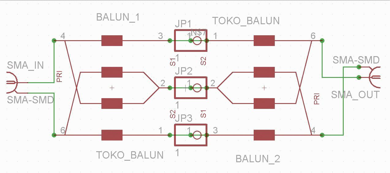 @Wolfgang M.: Danke für die ausführliche Antwort. Über die Methode hatte ich auch schon nachgedacht. Ich hab nur enorme Probleme den jeweils 3. Port mit möglichst guten 50 Ohm abzuschliessen und dann aber wieder Messungen darüber zu machen. Entweder ich mache das mit einem SMA-Abschluss oder mit 100R||100R direkt auf dem Board. Beides hat Nachteile. Bei einem SMA-Anschluss habe ich am 3. Tor eine zusätzliche Länge zu berücksichtigen. Bei den Widerständen muss ich wärend des Messens an der Schaltung rumlöten, was die Reproduzierbarkeit einschränkt. Beide Methoden hängen in der Meßgenauigkeit extrem vom verwendeten Abschluss ab (den ich dann ja als ideal annehme). Was ich mal probieren wollte ist, ob ich evtl. ein solches Kalibriersubstrat (siehe Bild) herstelle. Der Balun da drauf ist ein Balun von Toko. Die Werte für das Cal-Set des NWA könnte ich mit Sonnet errechnen.
