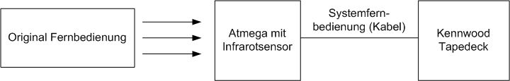 Hallöchen, ich habe ein edles Kennwood-Tapedeck in meiner aktuellen Audio-Anlage. Das Tapedeck besitzt selbst keinen Infrarotsensor, jedoch einen Eingang für eine Systemfernbedienung. Außerdem habe ich auch die "alte" Anlage noch, welche einen Kennwood-Receiver mit eben diesem Anschluss beinhaltet. Die jetzige Anlage ist nicht von Kennwood und bietet somit auch keinen Anschluss für die Systemfernbedienung. Meine Idee wäre nun, dass ich einen Infrarotsensor an einen ATmega hänge, und diesen die Signale der Systemfernbedienung generieren lasse. So, und damit enden auch schon meine Ideen. Schaltung aufbauen, ATmega programieren... das ist alles kein Thema. Habe ich alles hier griffbereit. Aber wie geht das mit dem Signal? Gibts eine Spezifikation? Kennt die jemand? Oder kann ich die irgendwie abgreifen? Ich bin für jeden Hinweis dankbar. Skizze siehe Anhang.