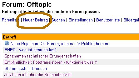 Mike C. schrieb: > Jens G. schrieb: > Ansonsten solltest Du Dir abgewöhnen, bestehende Threads für ein neues > Thema zu kapern. > > Sorry, aber bin nicht so vertraut mit dem Forum, aber weiss leider noch > nicht wo man ein neues Forum anlegen kann. Du könntest es mir doch bitte > verraten /-: Forum brauchst du auch keines anlegen. Nur einen neuen Beitrag. > Ich werde wohl etwas herumexperimentieren müssen, bis das richtig > funktioniert. Danke dir. Eigentlich nicht. Du brauchst nur logisch denken und ein wenig die Seite studieren. Da du etwas neues anlegen willst, wirst du das wohl nicht im Zusammenhang mit einem bestehenden Beitrag machen können. Aber wohl in der Übersicht, in der alle Beiträge zeitlich geordnet gesammelt sind. Und siehe da: gleich unter dem Forums-Namen (in diesem Fall eben "Off Topic") findet sich eine Zeile mit den Möglichkeiten. Und da gibt es dann den Punkt "Neuen Beitrag" Aber: Auch wenn du zur Zeit gerade einen Beitrag liest, findet sich in der Befehlszeile ebenfalls der Punkt "Neuer Beitrag". Funktioniert genau gleich. Schau einfach mal unter diesen Kasten hier. Auch da existiert eine Befehlszeile. Und auch da findet sich "Neuer Beitrag" wieder.