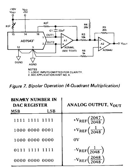 Hmm! Jetzt ist der Groschen gefallen! Mit A1 wird das Analogsignal invertiert und auf A2 gegeben, der ein invertierender Addierer ist. V_Ref wird dort mit 1:2 ggü. dem invertiertem Analogsignal gewichtet. Und das Rätsel um R6 (5k) ist auch gelöst! Toll, vielen Dank! Aus purer Neugier: Warum heißt das Ding "4-Quadrant Multiplication"? Jan