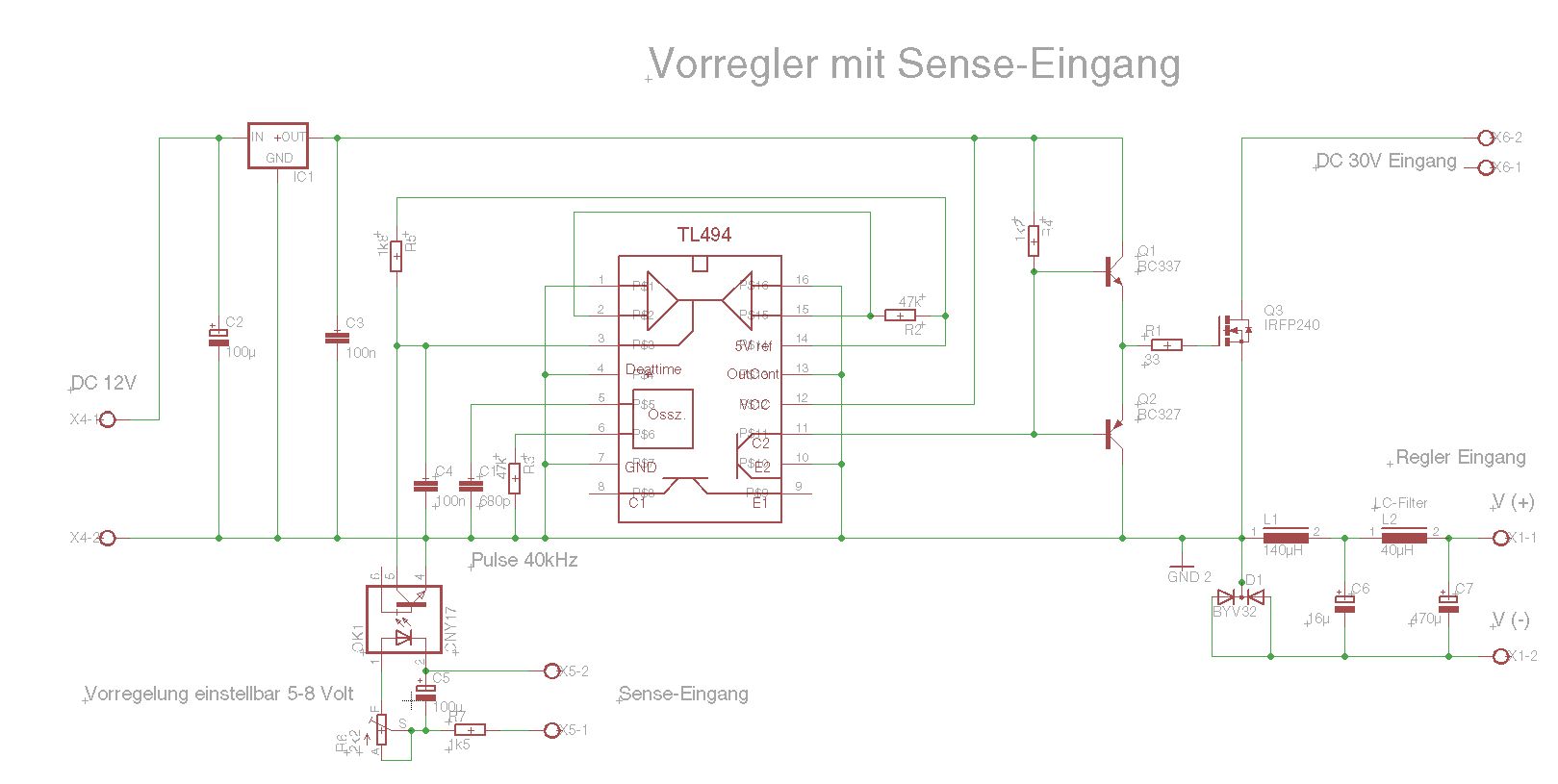 hohoho, da hast du jetzt aber nen' Rekord im Gekritzel aufgestellt! Ich mußte solange in die Röhre gucken, bis der Bildschirmschoner an ging :-) Du hast ja den kompletten TL082 rausgeschmissen. Mit dem betagten '741' wird hier gleich die Diskussion losgehen... Wo soll denn der Ausgang vom OpAmp hin??? Die Zehnerdiode für den OpAmp geht, für den µC mit Display auf wird es Saueng! Die Ladungspumpe gibt nur ein paar Milliampere her, das Display braucht so um die 140mA! Hier konnte ich mal eine Vorreglung mit TL494 und MosFet ausgraben, ist nicht von mir, habe sie nur komplementiert. Der TL494 taktet da mit 40kHz für den MosFet und hat einen potenzialfreien Sense-Eingang. Gemessen wird am Spannungs-Ein u. Ausgang mit einem Optokoppler. Je nach Einstellung wird dann 5-8V vorgeregelt Am We. baue ich die Schaltung mal auf und werde das mal testen. Gruß Michael