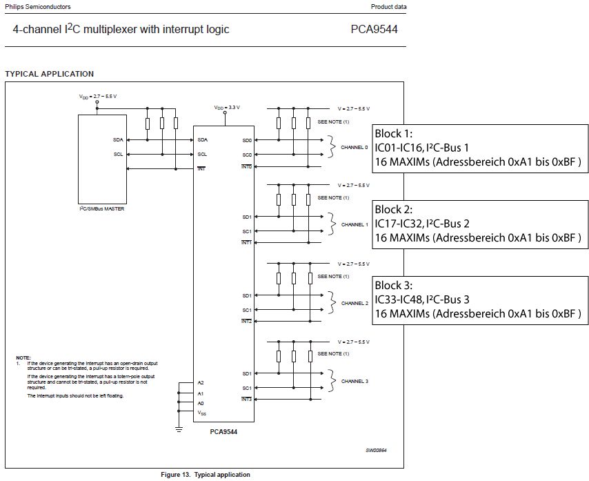 mal laut überlegen: Slave-Adressen vom MAX6953 lauten auf "101x xxx1" (LSB 0...read, 1...write) d.h. 0xA1 bis 0xBF (im Schreibmodus) Block1: IC01-IC16, I²C-Bus 1, 16 MAXIMs mit Adressbereich 0xA1 bis 0xBF Block2: IC17-IC32, I²C-Bus 2, 16 MAXIMs mit Adressbereich 0xA1 bis 0xBF Block3: IC33-IC44, I²C-Bus 3, 16 MAXIMs mit Adressbereich 0xA1 bis 0xBF Mit dem Philips PCA9544 hab ich die Maske "1110 xxx1" für Write d.h. 0xE1 bis 0xEF (im Schreibmodus) jetzt kann ich 3 I²C-Blöcke realisieren, indem ich den PCA9544 verwende. Vgl. Attachment 'Aktivieren von I²C-Bus 1 0xE1 0x04 'enable Channel 0 'Ausgabe am IC1 0xA1 0x20 0x01 0x02 0x03 0x04 'schreibe die Zahlen 1234 'Aktivieren von I²C-Bus 2 0xE1 0x05 'enable Channel 1 'Ausgabe am IC17 0xA1 0x20 0x05 0x06 0x07 0x08 'schreibe die Zahlen 5678 Oder hab ich da was übersehen?