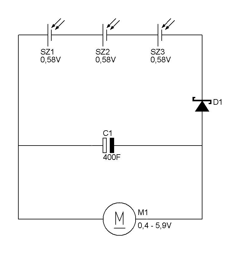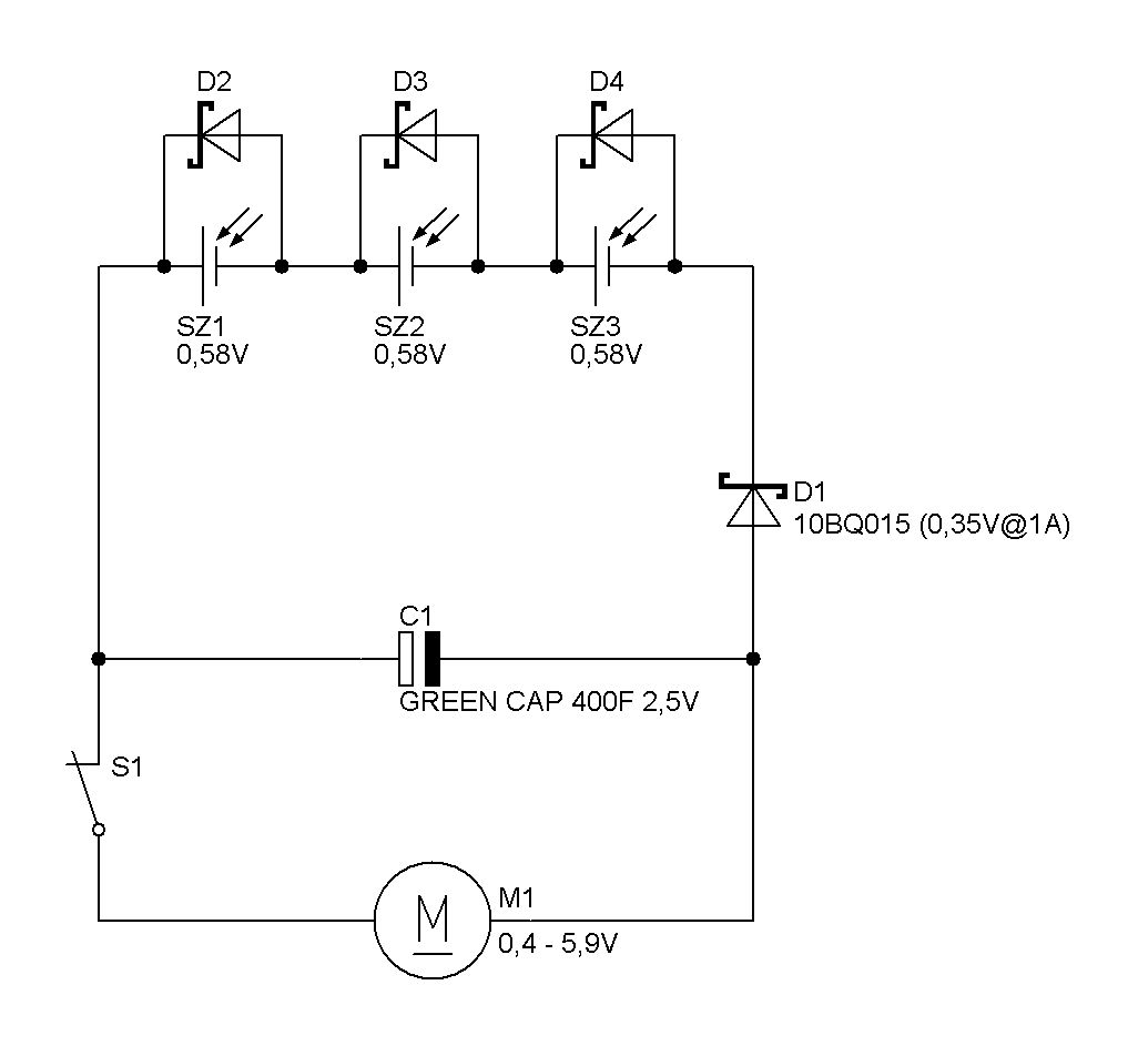 Hallo Leute Ich versuche eine Schaltung zu realisieren, die einen Motor so lang wie möglich mit Strom versorgt. Primär soll dies über Solarmodule geschehen, die überschüssige Energie soll für schlechte Zeiten (Wolken,Nacht,...) in einem Goldcap gespeichert werden. Die angehängte Schaltung ist nur eine Idee von mir, ich habe keine Ahnung ob das so funktionieren würde. Techn. Daten: Motor: Anlaufspannung: 0,4 Volt Spannungsbereich: 0,4 - 5,9 Volt Anlaufstrom: 25 mA Stromverbrauch: 30 mA (bei 0,5V) Solarmodule: Leerlaufspannung: 0,58 V Leerlaufstrom: 850 mA 3 Stück Kondensator: GREEN CAP 400F 2,5V http://www.conrad.de/goto.php?artikel=451435 kann auch nen kleinerer werden, je nachdem was sinnvoll ist Skotty-Diode: ???? <--dachte hauptsache eine die den Strom auch verkraftet und geringen Spannungsabfall verursacht Würde mich über Vorschläge oder Anregungen freuen :). Mfg