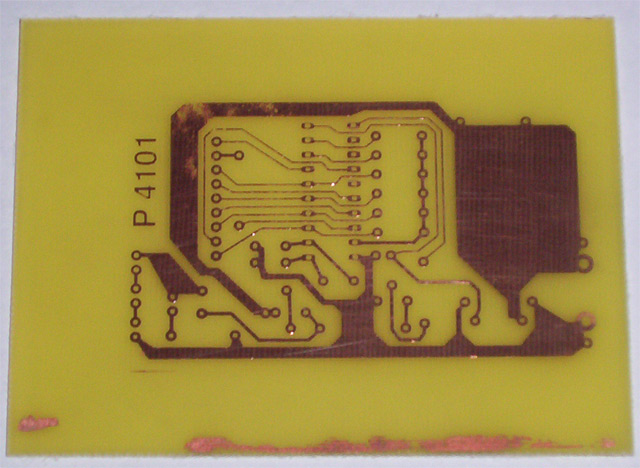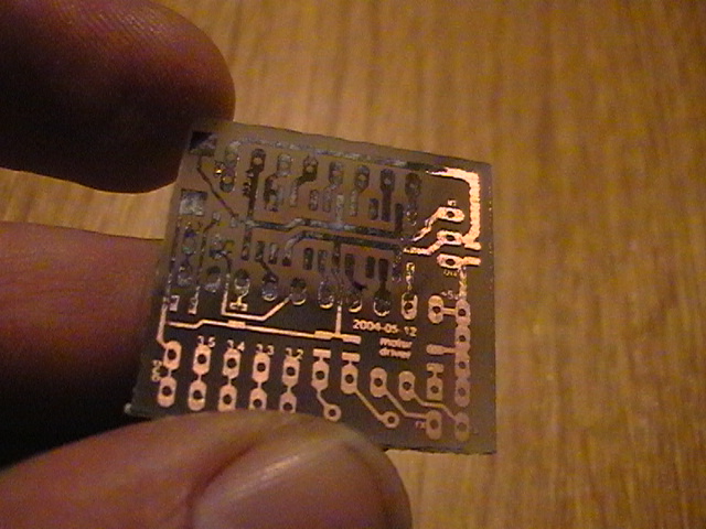 hi leute, hab gestern abend noch schnell eine platine hergstellt. gesamtdauer vom layout ausdrucken bis zum bohren ca. 1/2 stunde. ich drucke das layout 1:2 aus, kopiere es dann (50%) auf ein beschichtetes papier (werbeprospekt o.ä.), bügle die toner vom prospekt auf das kupfer, weiche das papier auf wegwisch, anschliessend ätzen in salzsäure/peroxyd. genauere anleitung gibts unter www.vocalcords.at/electronic/platine.html angehängt hab ich ein bild meiner gestrigen arbeit ich hab den toner erst halb entfernt, das sieht cool aus und funtzt sogar mit smd ic leiterbahnen (3 stk so08)
