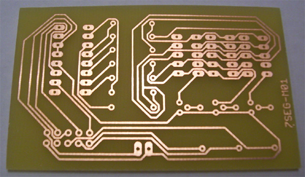 Hallo zusammen, hab nun die für mich (momentan) beste Methode gefunden um eigene Platinen herzustellen. Ich drucke mit meinem Epson Stylus 740 auf Spezialbeschichtetes Papier 100mg/m², bis 1440 dpi (gibt's ab und zu bei Aldi), befeuchte die Vorlagen mit Speiseöl bis Sie schön transparent wird, lasse die Vorlage ca. 2 Stunden trocknen, blichte dann 4 Minuten mit dem Gesichtbräuner und ätze in ca. 15 Minuten die Platine. Im Anhang ist ein Bild meiner letzten Platine, leider etwas unscharf, sorry Mfg, Nanobot