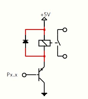 Dem Datasheet nach zu schliessen haben diese Krieger die Charakteristik von 8051 I/O-Pins (isses wohl auch). Die Tips in [[Relais mit Logik ansteuern]] sind also nicht anwendbar, von der reinen MOSFET-Variante mal abgesehen. Die Ausgänge sind demzufolge Open Drain mit internem Pullup. Dass die 12V-tauglich sind steht nicht drin, würde ich auch nicht unbedingt ausprobieren. Aber: In diesen Datasheets steht auch drin, wie die sich eine Ansteuerung von Relais vorgestellt haben. Wobei dort zwar von 5V-Relais ausgegangen wird, aber die dort gezeigte PNP-Kollektorschaltung funktioniert auch bei 12V-Relais.