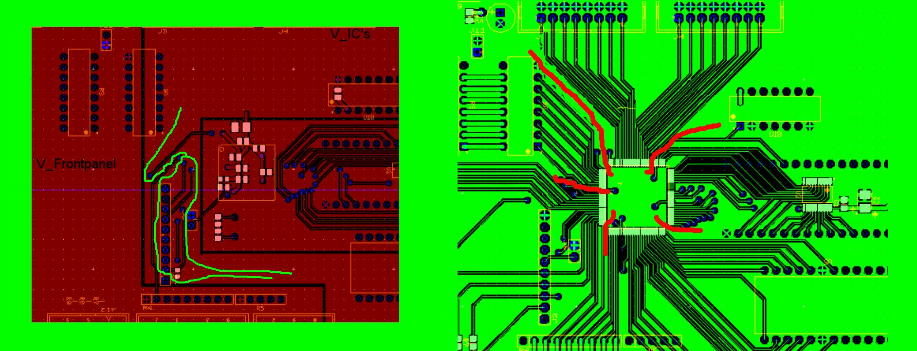 1) Deine Flächen sehen nur flächig aus, der Strom muß aber u.U. ganz hübsch verzweigte Pfade nehmen (grün im roten Vcc-Layer). 2) Du kannst ohne große Änderungen die Masse besser führen (rot im grünen GND-Layer).