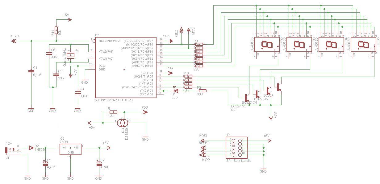 Habe hier nun eine Schaltung zur Temperaturmessung angefertigt. Könnt ihr hier Fehler finden, da ich es schon öfters überprüft habe?!