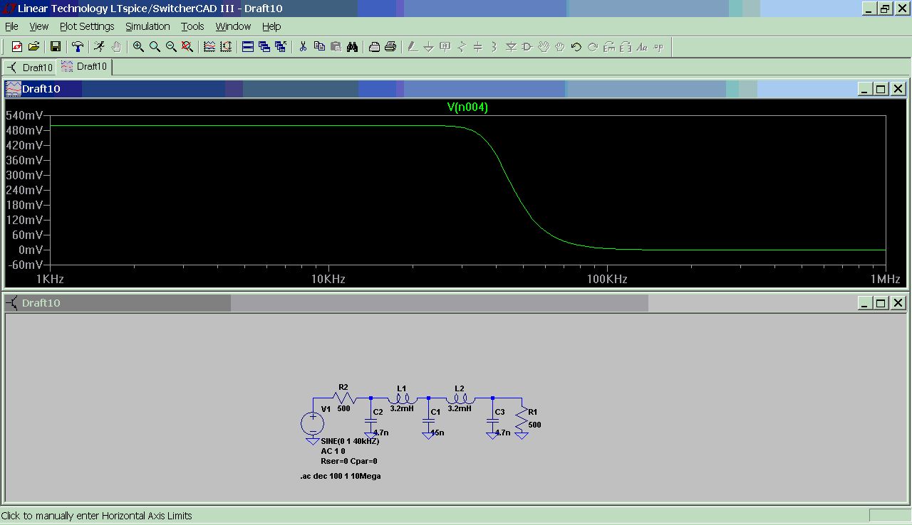 Ich habe dir mal ein LC Filter simuliert. Grenzfrequenz 40KHz. Ordnung: 5 Filtertype: Butterworth Gruss Helmi