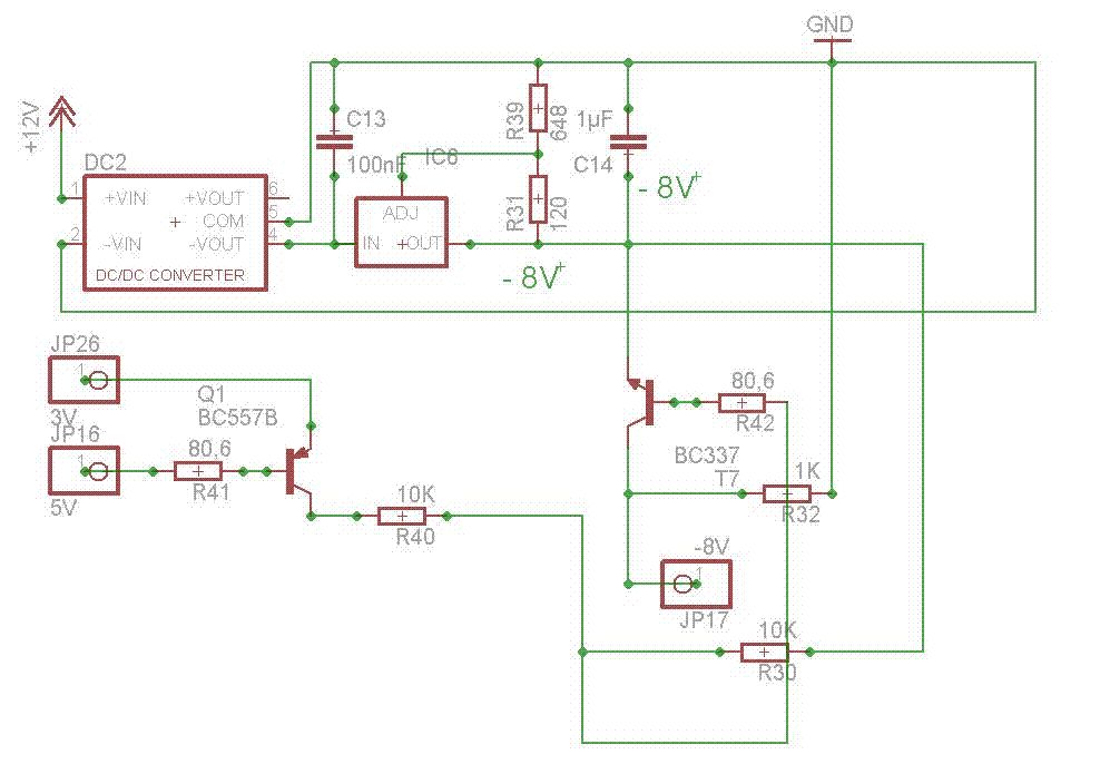 Mahlzeit Ihr lieben. Habe die Schaltung von lkmiller übernommen und noch einen Spannungsregler eingebaut, da ich -8V schalten möchte. Das funktioniert auch soweit alles, vielen Dank für die Skizze. Jedoch habe ich noch eine Frage zu dieser Schaltung. Wozu dienen die 10k Widerstände? Dienen sie der Strombegrenzung, so wie mein 1k Widerstand am Ausgang? PS: JP16 wird vom uC geschaltet. Vielen Dank für eure Bemühungen. Wäre echt schön, wenn Ihr mir helfen könnt. Gruß Guido