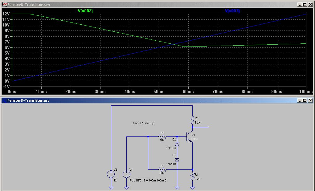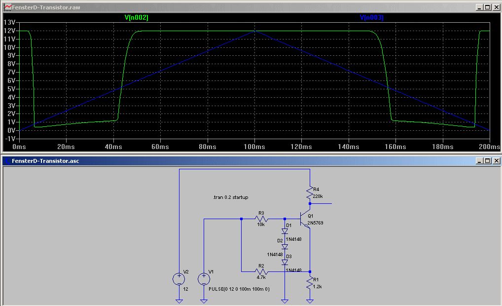 mach mal R2=2*R1, und R4 vielleicht so 10k-20k (sonst hat das Ding zu geringe Gesamtverstärkung) Der erste Umschaltpunkt ist dort, wo Ube=0,6V erreicht wird (Ub steigt schneller als Ue wegen dem Spannungsteiler an E (R1+R2), womit Uc auf L geht. Wenn Ub=x*Ud (Diodenreihe), wird Ub geklemmt. Bei weiterer Erhöhung steigt Ue soweit an, daß Ube wieder kleiner 0,6V wird - Uc geht wieder auf H. Ok, der L-Pegel geht nur max. bis auf Ue runter - und das ist variabel. Aber wie gesagt - es ging mir nur ums grundsätzliche erstmal. Berechnung: wenn ich Lust habe heut abend, werde ich es mal herleiten so als neue Übung ;-) Aber immerhin, man sieht schon drei Phasen in deiner Simu ;-)