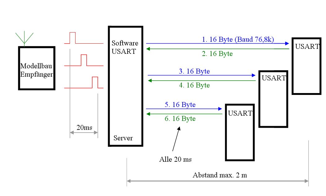 Hallo, ich möchte die Pulslängen eines 8 Kanal Modellbauempfängers in Byte umwandeln und diese dann digital an 8 Atmega8 weitergeben. Die MC sollen aber auch miteinander komunizieren können (eventuel über einen Server). Ich habe mir die folgende Möglichkeit überlegt: Ein MC arbeitet als Server und wandelt die Pulsweiten-Signale des Modellbausenders in Bytes um und verschickt diese zuerst an den ersten MC. Dieser antwortet gleich nach dem er den Datenpacket erhalten hat. Diese Antwort kann dann nun von dem Server an die restlichen MCs verteilt werden (siehe Anhang). Ich bin ganz zuversichtlich, dass ich das so hinbekommen kann. Was ich aber gerne wissen würde, welche Alternativen ich noch zu diesem Aufbau hätte: Eignet sich etwa der TWI besser für diesen Zweck? Gruß Zoltan