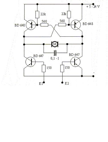Hi Basti Bei dem Motor handelt es sich um einen Gleichstrommotor, nehme ich an(der Typ wurde im ganzen Thread nicht explizit genannt.)? Die Links-Rechts-Drehung lässt sich über 4 Transistoren, die mit 2 Kanälen(einer low und anderer High ist eine Richtung, andersrum die andere und beide low heisst Stillstand. Beide High sollte die Software vermeiden, da dies zu einem Kurzschluss führt) des µControllers angesteuert wird, bewerkstelligen(ein Schaltplan liegt diesem Posting bei). Die Transistortypen und Widerstände sind nur mal exemplarisch eingesetzt (je 2mal PNP und NPN der gewünschten Leistung halt). Sollten zwei Leitungen nicht möglich sein, wird die Schaltung etwas komplizierter. Dann kann man (entweder ein moduliertes Signal erzeugen oder) über einen Spannungsteiler(und zwei Ports des µC) Pegel von -5V,0V und +5V für Links,Stillstand und Rechts übermitteln(braucht dann für die Motoransteuerung aber 6 Transistoren). Das Problem mit den Überschwingern ist bei ausreichender Abfragerate i.d.R. nicht so schlimm, da die Betriebsspannung beim Pendeln über der Zielstelle so schnell umschaltet, dass der Motor automatisch langsamer wird (wenn der Motor natürlich einen Zeichenarm oder sowas steuert, könnte das hässlich werden. Soll er einfach so schnell wie möglich an der Zielposition anhalten, geht das aber mindestens genausoschnell, wie schon vorher die Ansteuerrate verringern.).