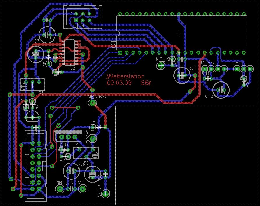 Zwei Dinge sind wichtig: Du darfst die Vias nicht ungluecklich unter Bauteilen platzieren (z.B. SMD-ICs), da sie ja eine raeumliche Ausdehnung nach oben haben, was "echte" Vias nicht haben. Ausserdem kannst Du einige Bauteile nur von unten anschliessen, z.B. Pinleisten. Denn hier kannst Du nicht von oben loeten, zumindest nicht, wenn es nicht nach Pfusch aussehen soll. Und nur so am Rande: Fuer obiges Layout kommst Du auch problemlos mit einer einseitigen Platine hin. Gruss, Michael