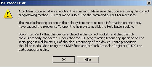 Hallo! Sorry, hatte ich vergessen zu erwähnen: Ein Update der Firmware (Version, die mit dem aktuellen AVR-Studio geliefert wird) und eine Neuinstallation des AVR-Studio haben das Problem auch nicht behoben. Bei sehr kleinen ISP-Frequenzen dauert es nur länger bis die Fehlermeldung erscheint ;-) Habe hier auch etliche Kombinationen Taktraten und ISP-Frequenzen getestet. Könnte das ganze höchstens heute Abend mal mit einem anderen Rechner testen. Viele Grüße