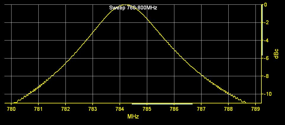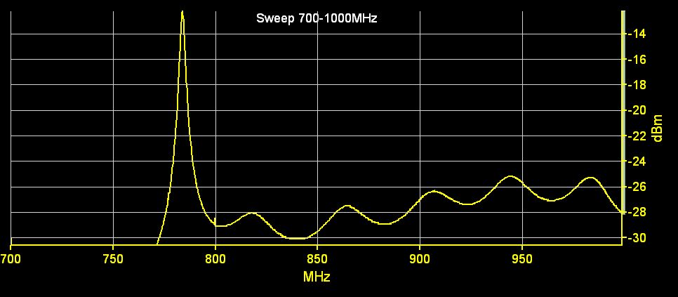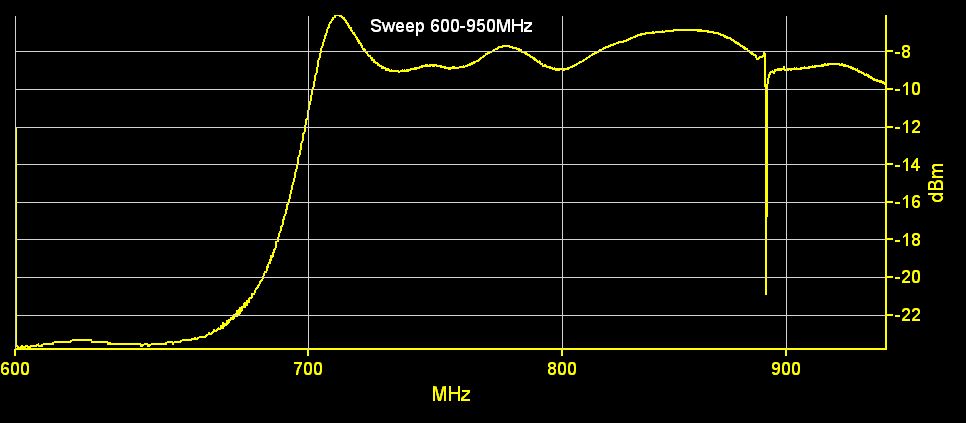 Hier noch der Frequenzgang des Mischprodukts nach dem LPF. Da ich den VCO momentan nur mechanisch verstellen kann, hab ich für die Aufnahme den VCO auf 820Mhz eingestellt und stattdessen den LO Sweeper von 600-950Mhz durchlaufen lassen (Frequenzskale in der Aufnahme). Der scharfe einbruch bei 820Mhz entspricht der 0 Schwebung wenn VCO=LO. Der Abfall Links ist die Obergrenze des 200MHz LPFs. Rechts von 820MHz gehts dann wieder Spiegelbildlich weiter. Am LPF kommen natürlich die 0-200Mhz raus.