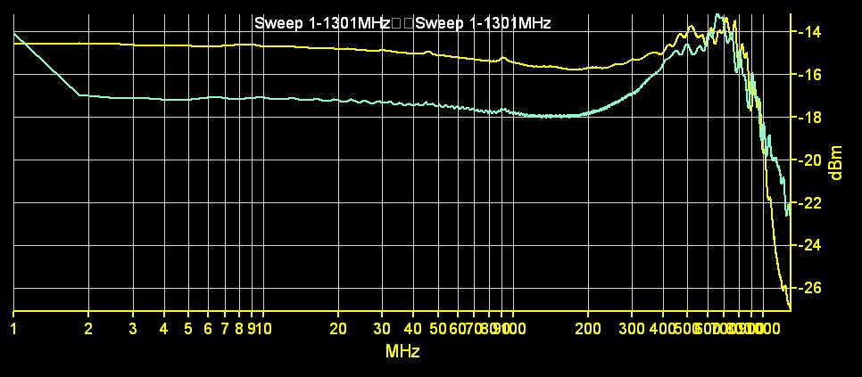 Hier der Frequenzgang des BF1009 Mixers. Gelb: Gate 1, Gate 2 Open. Blau: Gate 2, Gate 1 Open. Jeweils -10dBm aus dem Sweeper. Den Gate 2 Bias hab ich "nach bestem Mischergebnis" gewählt. Wie man sieht ist der Frequenzgang (zumindestens für die Art des Aufbaus) ohne jeglich zusätzliche Anpassung für einen ersten Wurf doch garnicht mal so schlecht, oder? (der Knick bei 1-2Mhz ist ein Aufnhameartefakt).