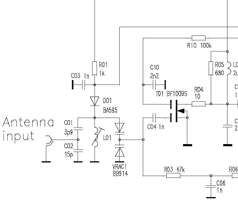 Wo hast du die Applikationnote zum BF1009 her aus dem dein Schaltplanausschnitt stammt? Ich habe bisher nur das kleine vierseitige Datenblatt gefunden. http://www.criseis.ruhr.de/bf1009.zip http://www.criseis.ruhr.de/bf1009.gif Falls du mal Langeweile haben solltest, ich habe hier ein selbstgebasteltes Modell fuer SwitcherCad abgelegt. Ich kann keine Garantien dafuer abgeben das es sich wirklich, besonders natuerlich im oberen Frequenzbereich, so verhaelt wie der originale Transistor. Aber ich dachte du willst das vielleicht mal ausprobieren und mir darueber berichten. :-) Fuer die Mitleser, den BF1009 gibt es derzeit sehr billig bei Pollin. Da kann man sich schonmal 100Stk fuer Notzeiten weglegen. .-) Olaf