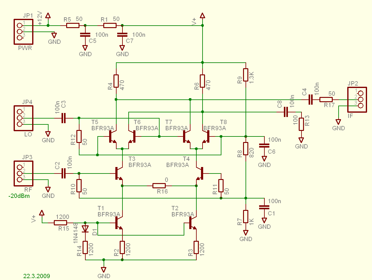 So, nachdem ich endlich wieder etwas Zeit gefunden habe, hatte ich noch einiges ausprobiert (Blech Gehäuse für den VCO, weiterer VCO auf BF1009 Basis, bessere stabilisierung der VCO Abstimmspannung,LPF am VCO Ausgang, uvm.) - leider ohne Erfolg. Aus purem Übermut hab ich auch noch eine Gilbert Zelle aus 8 BFR93A zusammengelötet. Geht auch sehr prächtig, konnte auf Anhieb und ohne viel Optimierung bis über 1.2GHz mischen. Aber leider wieder das selbe Phänomen: unter 1MHz IF starke Verzerrung des Mischprodukts. Irgendwie scheine ich da was grundsätzlich noch nicht verstanden zu haben. Da das mit der Gilbert Zelle und den VCOs so gut geht, könnte man ja damit einen 400MHz Sinus Generator bauen oder sogar einen primitiven 400MHz SA. Allerdings muss ich erst mal schauen wie man sehr schmalbandige Filter für die erste ZF baut, scheint ja in dem Frequenzbereich nicht so einfach zu sein. >>Double Balanced Diode Mixer, >Bessere Großsignalfestigkeit. ... >Zwar sind die Diodenmischer in der Tat besser großsignalfest (was man vor >allem abends auf 7 MHz in Europa schätzen lernen kann Für solche Fälle wäre dann ein FET Schalter anstelle der Dioden doch Ideal. Eventuell für so niedrige Frequenzen einfach ein HC4053 für die +-1 Multiplikation.