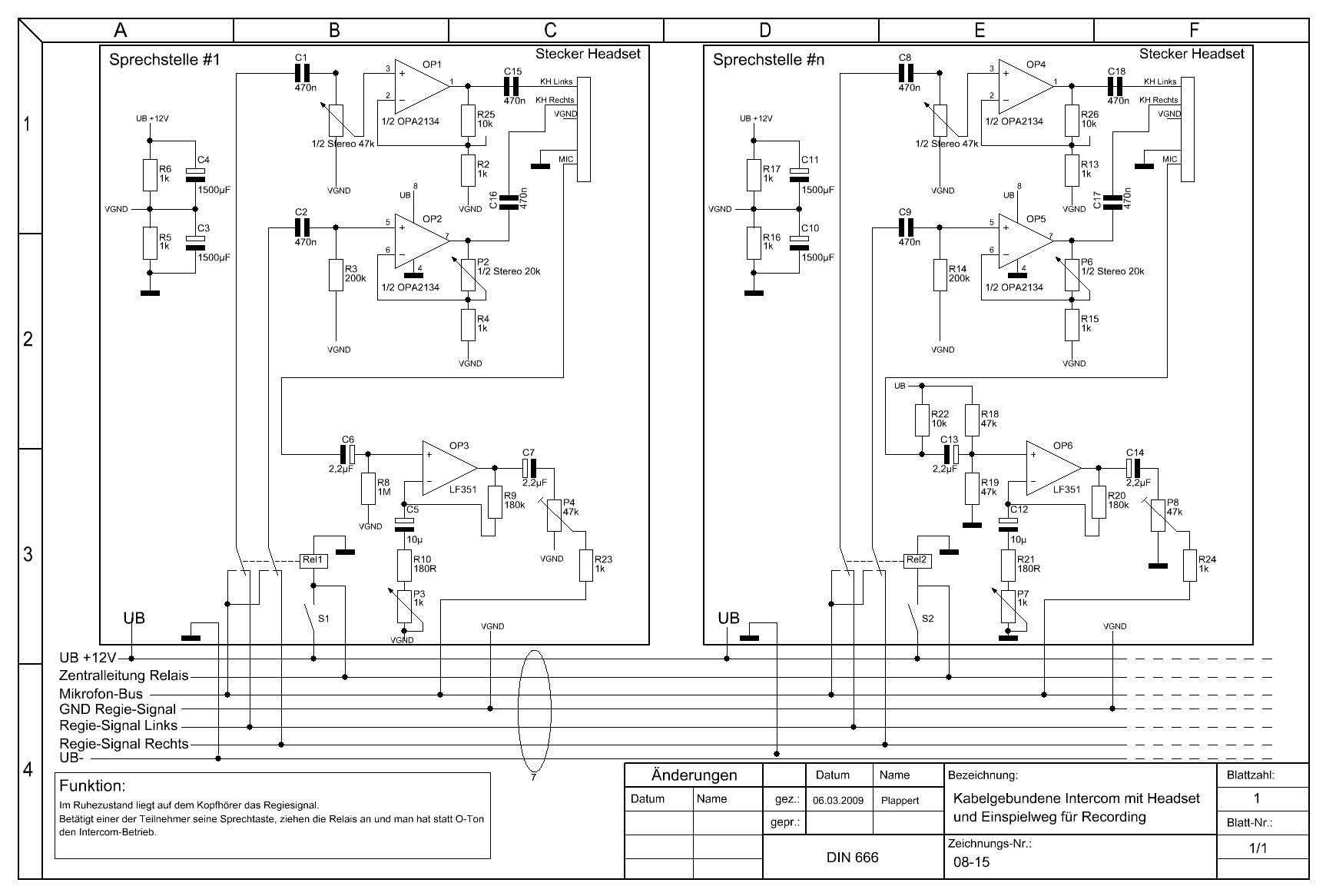 > Ich dachte das wären "ganz normale" Stützkondensatoren für VGND. Richtig, diese Kondensatoren sorgen dafür, dass auch wirklich Vcc/2 durch den Spannungsteiler generiert werden, und halten die Impedanz für Wechselspannung niedrig. Durch die Ankopplung aller dieser Stützpunkte an die Regie_GND schaffst du eine Art "schwebende" Masse über alle Teilnehmer. diese Masse ist wechselspannungsmäßig recht stabil, aber eigentlich nur über die 1k-Spannungsteiler gleichstrommäßig definiert. Richtig: die Entkoppelkondensatoren am KH-Ausgang kannst du dir auf diese Art sparen (das hat Lupin auch schon angemerkt). > Ich habe sogar beim Mikrofon daran gedacht es pseudosymmetrisch zu > machen, damits ned ganz so arg schlecht klingt. Du hast das Mikrofonsignal "mono" angeschlossen, mit "symmetrisch" hat das nicht viel zu tun.
