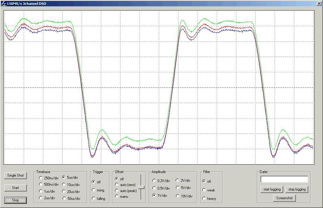 Hier noch eine weitere Idee für ein Low Cost Oszi: FPGA + Video ADC Prinzipiell läuft das ganze bei mir schon mit 150MS/s, leider musste ich das Projekt aus Zeitgründen aber erstmal beiseite legen. Das teuerste an dem ganzen sind die analogen Eingangsstufen. Als FPGA reicht ein ganz kleiner, z.B. ein XC3S50AN (ca. 10€), als ADC habe ich den TVP7000 verwendet, der für rund 6€ (ja: 6€ für ein 3 Kanal 150MHz 10bit ADC!) erhältlich ist. Dazu noch 2-3 Video OPs für jeden Kanal (je etwa 2-5€), ein Bereichsumschalter, usw. und fertig ist das DSO Frontend. Das ganze kann man jetzt noch mit einem µC+LCD oder mit einem USB Interface erweitern und fertig ist das komplette Oszi. Obwohl das ganze bei mir momentan auf Lochraster aufgebaut ist, waren die ersten Ergebnisse sehr beeindruckend, da kaum Rauschen auf dem Signal, wie man an dem 150kHz Rechteck erkennen kann.