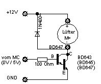 Hi... Sorry, Anhang vergessen... ;-(( Na das ist doch ein Wort... Das dürfte recht einfach mit einem NPN-Darlington-Transistor BD675 (oder ähnlich) funktionieren. Das ist ein 4A-Typ, müsste also den Anlaufstrom des Lüfters vertragen. Kann aber sein, dass du ihn etwas kühlen musst. Im Anhang findest du die (grobe) Schaltung. Ich nehme an, dass sie durch weitere Diskussionsbeiträge noch optimiert wird (Widerstandswert). ;-)) Die Diode MUSS unbedingt sein, sie schützt den Transistor vor Spannungsspitzen, die beim Abschalten des Motors entstehen. Viel Erfolg... ...HanneS...