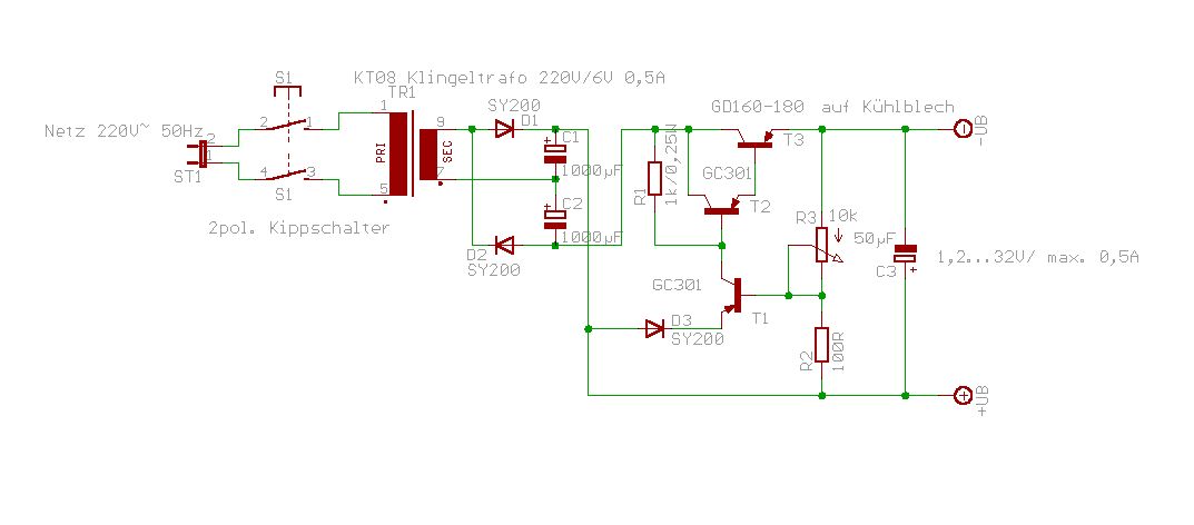 @crazy horse : hast recht, jetzt seh ichs auch, ist ja echt ne Antiquität. Die Transen, GDxxx... Nimm nen gescheiten Trafo, dann kannst Du Dir die Verdopplerschaltung (Greinacherschaltung) sparen, dazu einen Brückengleichrichter (Greatz-Brücke) einen 1000uF Elko und nen LM317 zwei 100n Kerkos einen 10u Tantal einen 240ohm widerstand und einen 5k Poti und fertig