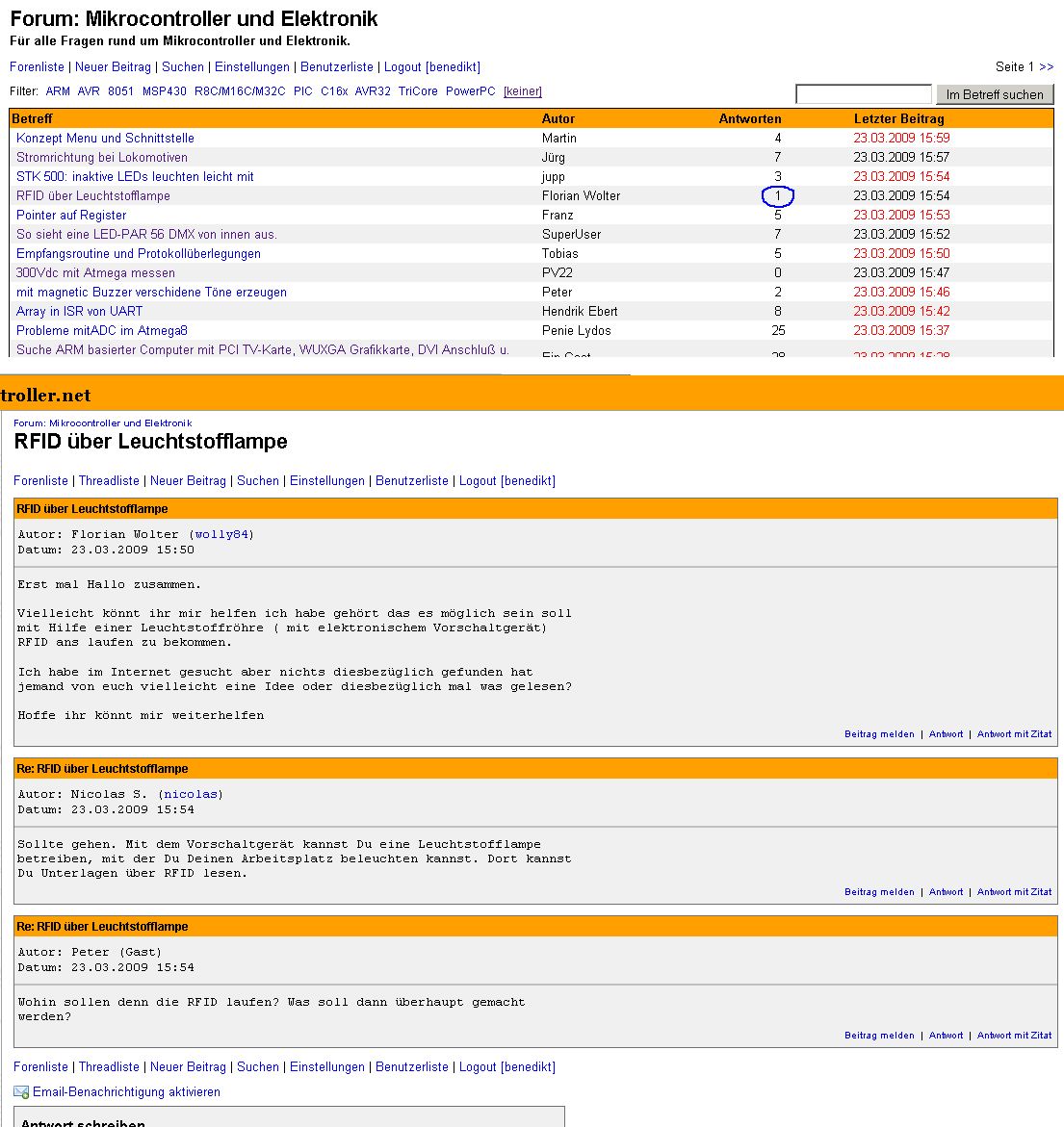 Ist das nur bei mir so, oder passt da der Zähler nicht ganz? Hier steht 1 Antwort im Thread "RFID über Leuchtstofflampe": http://www.mikrocontroller.net/forum/mikrocontroller-elektronik Im Thread selbst, sind es aber 2: Beitrag "RFID über Leuchtstofflampe"