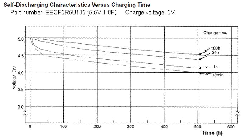 Wohl nach 500 stunden, die zeit die da mit dem Blitzchen angegeben wird wird wohl die charging time sein. Natürlich könnte man theoretisch mit genügend kondensatoren die uhr versorgen, wird aber je nach Strombedarf sehr teuer (praktikabel ist es halt nur bei kleineren Uhren/RTCs um kurze Stromausfälle zu überbrücken).