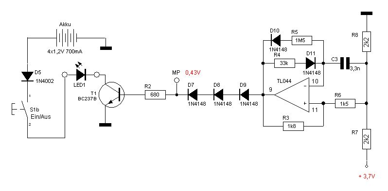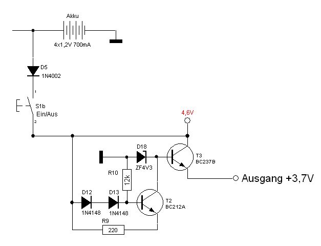 Der Schaltplan ist irgendwie komisch gezeichnet. Wenn ich keinen Knick in der Optik habe, dann bilden R9, R10, D12, D13 und T2 eine Konstantstromquelle, welche die Zenerdiode D18 speist. Das ganze bildet eine Spannungsreferenz an der Basis von T3. Die Schaltung ist ein diskret aufgebauter Spannungsregler ohne Kurzschlußschutz für etwa 3,7V. D5 ist ein Verpolungsschutz.