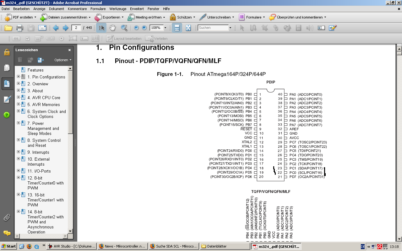 Ich hab mal ein Blöde Frage. Laut Datenblatt hat der ATmega324 eine I²C Schnittstelle. Aber auf dem Pinbelegungsplan (DIP Gehäuse) finde ich kein SDA oder SCL. Heißen die Pins unter Atmel anders weil die Schnittstelle als TWI lauft. Und aus dem Datenblatt werde ich nicht so richtig schlau. kann mir da jemand Helfen? mfg LPT