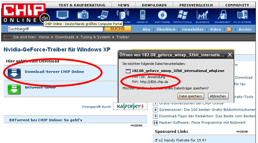 Du umsteuerst also die weitbekannten, großvolumigen Downloadportale damit Du in einem kleinem Forum wie diesem hier den Link vorgekaut bekommst? Ich könnte es Dir auch noch downloaden und per CD und Post schicken, dann müsstest Du überhaupt nichts mehr tuen! Nichteinmal mehr googlen! aber heute bin ich ja wieder lieb! bitteschön! http://www.chip.de/downloads/Nvidia-GeForce-Treiber-fuer-Windows-XP_13000370.html http://www.computerbase.de/downloads/treiber/grafikkarten/nvidia/nvidia_geforce/