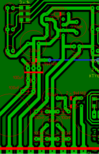 Johannes Studt wrote: > Die Drahtbrücken unten deswegen, damit ich keine Masseschleife oben um > den Regler herumlegen muss? Oder einfach, um es etwas "dicker" zu > machen? Damit das Ganze großflächig wird. Eine sinnvolle Alternative wäre es, zweiseitig zu arbeiten und die komplette Oberseite als Masse zu benutzen. An den Stellen, wo's nach unten gehen muss, musst du dann zur Not einen Via mit einem Draht realisieren. Alle Bohrungen auf der Oberseite, die nicht an Masse sollen, werden ein wenig freigesenkt. Aber schau erstmal, ob nicht die bessere Spule allein schon hilft, bevor du deart gravierende Umbauten vornimmst.