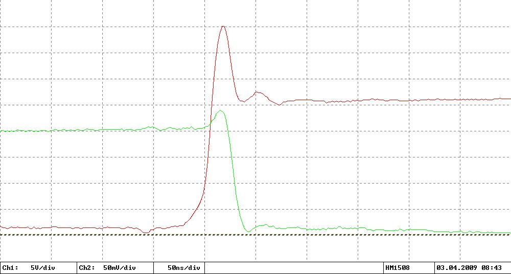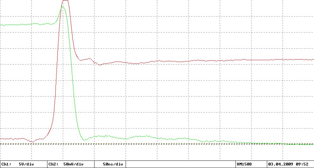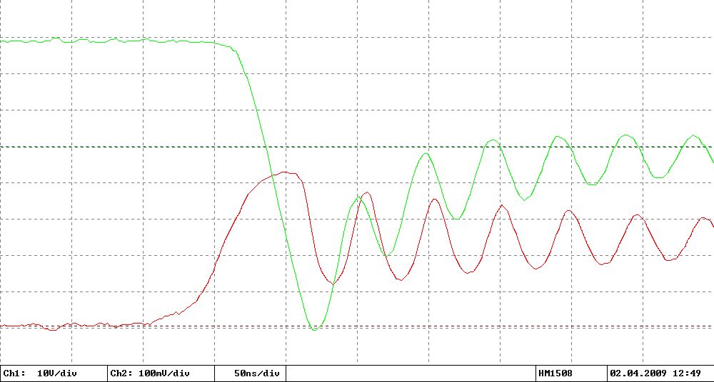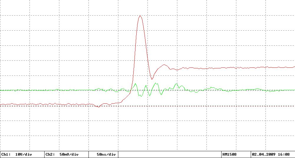 Ja, ich denke das kann ich ausschließen: Das Signal vom Shunt geht direkt über einen 47 Ohm Widerstand (zur Impedanzanpassung an das RG58 Kabel) an die BNC Buchse. Direkt am Oszi hängt auch nochmal ein 50 Ohm Abschlusswiderstand. Nur die bis zu 600V der Spannungsmessung möchte ich ungern direkt ins Oszi schießen, daher da über einen 10:1 Tastkopf. Momentan sind das aber nur etwa 20V + Überschwinger beim Abschalten.