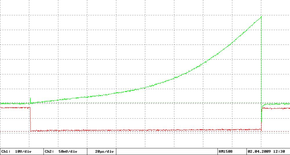 In etlichen Application Notes zu IGBTs findet man Bilder der Strom und Spannungsverläufe beim Abschalten von IGBTs und daraus errechnet die Verlustleistung. Hier finden sich z.B. solche Kurven in Figure 7-9 auf Seite 4: http://www.irf.com/technical-info/whitepaper/apec03nptigbt.pdf Ich wollte das ganze mal nachmessen, allerdings sehen meine Kurven leicht anders aus als die aus den AppNotes. Der prinzipielle Aufbau: Der IGBT/Mosfet wird über einen kräftigen Mosfet Treiber über 10 Ohm am Gate mit etwa +13V / -2V versorgt. Emitter/Source ist mein Massepotential vom Oszilloskop und der restlichen Schaltung um eine Beeinflussung der Strommessung durch den Gatestrom zu vermeiden. Die Strommessung geschieht über einen 33mOhm Shunt im TO-247 Gehäuse. Dieser liegt zwischen dem negativen Pol einer potentialfreien Spannungsquelle, die durch mehrere 68µF Elkos und einen 1µF Folienkondensator gepuffert wird und Masse. Zwischen Drain und positiver Betriebsspannung liegt eine Spule (kleiner Ringkern mit etwa 100µH), und parallel dazu eine schnelle Diode (HFA25PB60) die die Energie der Spule nach dem Abschalten verheizen darf. Nun wird der IGBT/Mosfet eingeschaltet und der Strom gemessen. Sobald dieser über einen bestimmten Wert geht, wird abgeschaltet. Dabei wird die Drain/Collector - Source/Emitter Spannung und der Source/Emitterstrom gemessen. Im ganzen sieht der Strom/Spannungsverlauf so aus wie im Anhang (rot: Kanal 1: Spannung, grün: Kanal 2: Strom). Dunkelgrün bzw. Dunkelrot gestrichelt sind jeweils die Nulllinien eingezeichnet. Der Ringkern beginnt etwas in die Sättigung zu gehen, aber das dürfte keinen Einfluss haben, da die Spule nur als zeitabhängige Stromquelle missbraucht wird.