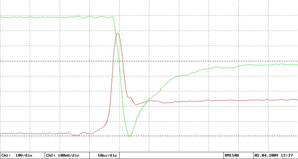 Ich habe das Layout rund um den Drain, die Gateanbindung usw. etwas optimiert (da jetzt der Platz des früheren Shunts frei wurde), jetzt sieht man den Tailcurrent relativ gut: Es sind immerhin rund 1A (2A/div) über >200ns. Nochmals danke an alle! Da wäre ich nie drauf gekommen. Gut, dass ich eine 10000er Rolle 1 Ohm Widerstände habe, jetzt weiß ich für was ich die gebrauchen kann...