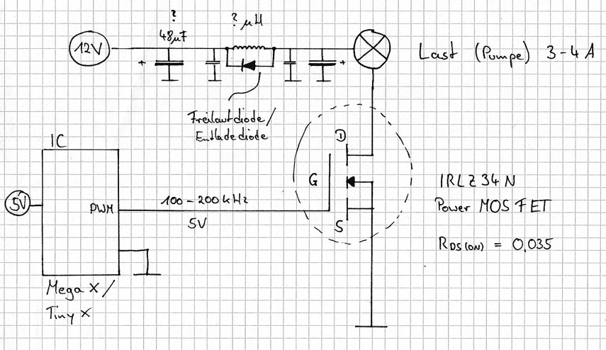 Also dass der FET mit 5 V läuft ist sicher! Zum Thema "Glauben" :-) Ich hab mal folgendes gerechnet: Vorwiderstand zum Fet 150 Ohm. Mit Lade- und Entladezeit sowie Trägheit etc. alle Werte aus dem Datenblatt (und zwar die max. Werte) kam ich auf ca. 16 khz frequenz. Dabei wäre der FET aber nur mit AN/AUS beschäftigt. Also würde nie ganz an sein (gerechnet mit 6 Tau). Ich kenn mich nicht aus, daher sage ich wieder - ich glaube - dass alles kleiner 1 kHz unkritisch sein müsste. Da ihr aber sagt, dass ich sowieso viel niedriger Takten soll, müsste es doch laufen. Wie kann ich die ideale Taktzeit nun ermitteln? Zur Ankerkonstante habe ich nichts weiter gefunden. Ich hab nochmal nachgesehen - die Pumpe zieht bei 12V 3 Ampere. Mehr weiß ich nicht von der Pumpe oder dem Motor der da drinn ist. Auf wie viel Hz oder MHz soll ich nun takten? Man kann es ja jederzeit verändern, aber wo fang ich an? 100Hz oder eher 500 Hz? Gruß Stomper