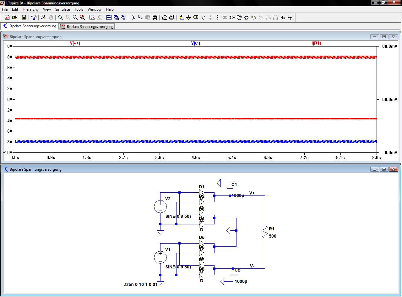 Hallo, nimm doch statt Spice einfach was althergebrachtes... Beide 9V-Wickulungen phasenrichtig in Reihe (so, daß 18V rauskommen). Die mitte ist Dein GND. An die Enden ein Brückengleichrichter. Das - Ende ist Deine negative Spannung gegen GND, das + Ende die postitive. 2x9V bei 13VA sind höchstens 0,7A. Da sind je 1000µ schon ok, 2x 2200µ schaden aber auch nicht. Was erwartest Du dann so an Leistung und bei welchem Lastwiderstand? Gruß aus Berlin Michael