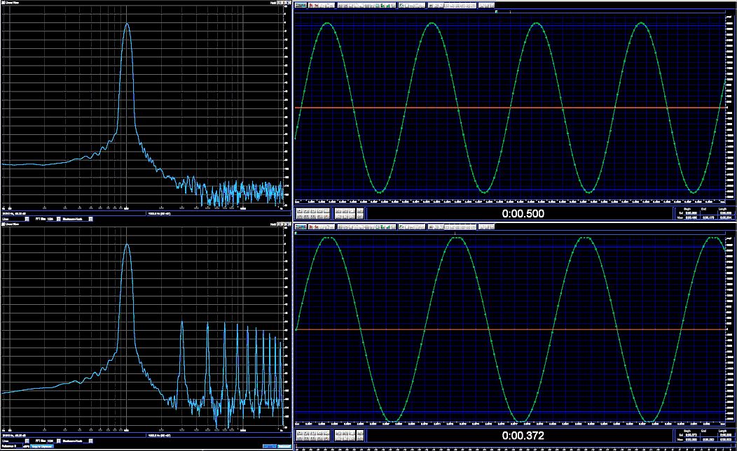 Axel Küger wrote: > Zu dem Analogen Teil habe ich noch eine Frage: > > Sind die Oberwellen in ihrer Amplitudenhöhe nicht so minimal, dass es > schwer sein wird, diese zu detektieren? Im Anhang mal zwei Bilder von einem 1kHz Sinus: Oben komplett, unten minimal übersteuert (etwa 2% der Amplitude fehlen). Bei 3kHz sind es bereits -54dB. Der Formel auf dem Link nach sind das etwa 5% Verzerrung. -54dB sind etwa ein Faktor von 0,002, das sollte man selbst mit einer 16bit Fixedpoint FFT hinbekommen.