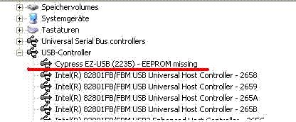 Also die CyConsole habe ich jetzt installiert. Dort wird das Board allerdings nciht erkannt. Was mich wundert, da es von EZ-USB Control Panel, was ich erst hatte erkannt wird. Im Geräte Manager steht es unter: Cypress EZ-USB FX2(68613) - EEPROM missing
