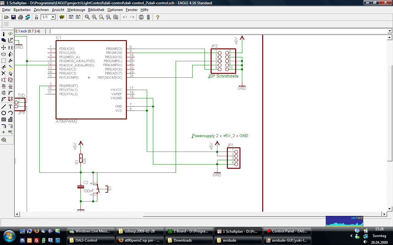 Hallo :) Ich stehe seit ein paar tagen vor einem Problem mit USBasp + uC. Ich habe mich hir tagelang eingelesen und rumgetüftelt, bin bisher aber noch zu keiner Lösung gekommen. Habe mir vor kurzem einen USBasp gebastelt: Print wurde bei uns in der Schule gefertigt, bestückt hab ich ihn selber. Firmware: usbasp.2009-02-28 Wird auch ohne Probleme im Gerätemanager erkannt (benutze Win Vista). Auf dem OS habe ich avrdude 5.6 installiert - WinAVR ist auch vorhanden für eventuelle libs etc. Zielhardware ist ein AT90PWM2B - Beschaltung des ISP siehe Anhang. USB-Kabel ca. 40cm lang ISP-Kabel ca. 20cm lang Eigene +5V-Versorgung bei Zielhardware vorhanden Nun, zu meinem eigentlichem Problem: Ich bekomme keine Kommunikation zwischen Laptop und uC her. Benutzte bisher zur Kommunikation die Kommandozeile oder die neuste version von avrdude-gui JP3 hab ich schon getestet (<1,5MHz) JP1 für +5V direkt vom USB wurde auch schon getestet bekomme immer den selbem Fehler (beim lesen sowie schreiben): avrdude.exe: error: programm enable: target doesn't answer. 1 avrdude.exe: initialization failed, rc=-1 Double check connections and try again, or use -F to override this check. avrdude.exe done. Thank you. Ich konnte bisher einstellen was ich wollte, nichts hat mich bislang weiter gebracht. Hoffe ich habe alle Informationen reingepackt die ihr benötig und natürlich das mir hier jemand behilflich sein kann. Freue mich auf eine Antwort :) Mit freundlichen Grüßen, Lukas
