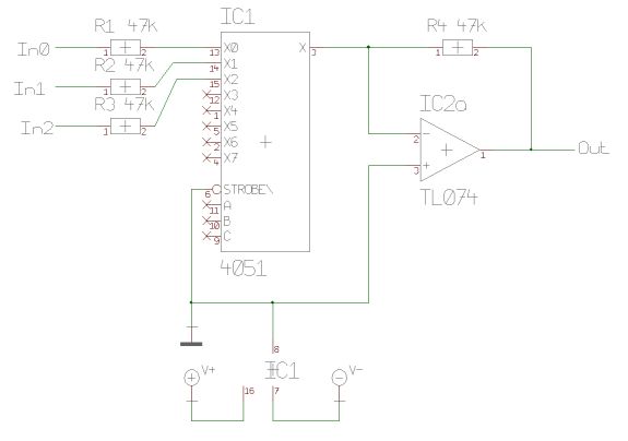 @Sven Die 4051/52/53 haben genau deshalb 3 Versorgungspins. Man kann sie mit +/-5Volt betreiben. Die Logikeingänge bleiben dabei CMOS-kompatibel. Der relativ hohe Innenwiderstand und vor allem eine Abhängigkeit des Innenwiderstands vom anliegenden Pegel bleiben ein Problem. Ich habe mal einen Vorverstärker gebaut, bei dem ein solcher Schalter am Eingang eines OpAmps lag in Reihe zum Eingangswiderstand (Schaltplan im Anhang). Vorteile: - Innenwiderstand des Schalters klein im Verhältnis zum Eingangswiderstand - Schalter liegt am virtuellen Nullpunkt, also auf konstanter Spannung.